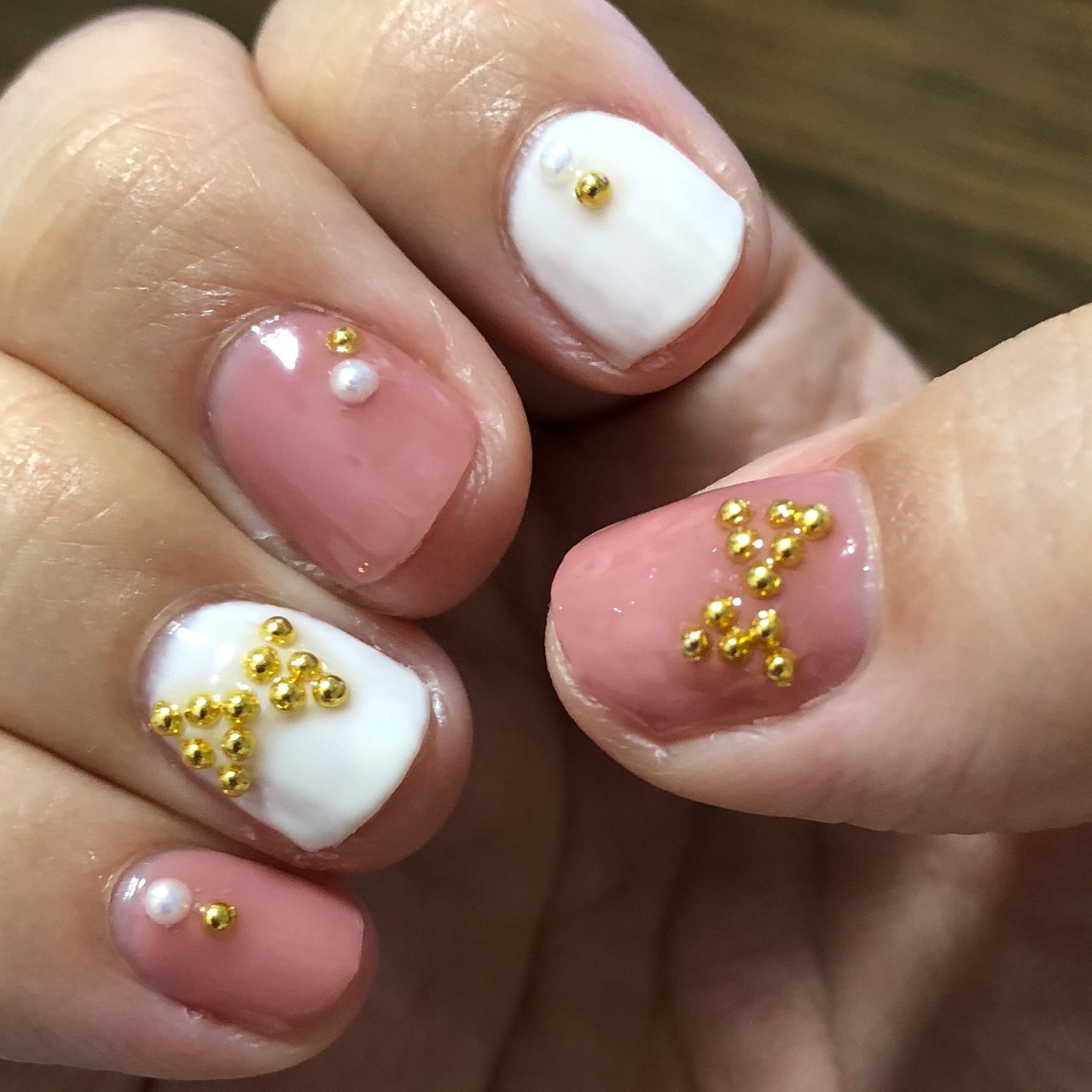 しずくネイルシール リボンネイル とスキンフードのラメラメピンクゴールドネイル 主にポリッシュセルフネイルです